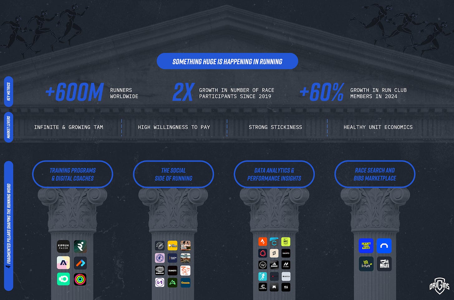 At Origins, we've built a strong thesis around scalable consumer business models, leveraging insights gathered from analyzing over 5,000 consumer businesses. Our deep dive into this expansive landscape has revealed a tremendous business opportunity within the running market underpinned by three major levers driving the potential for profitable and scalable billion-dollar ventures: